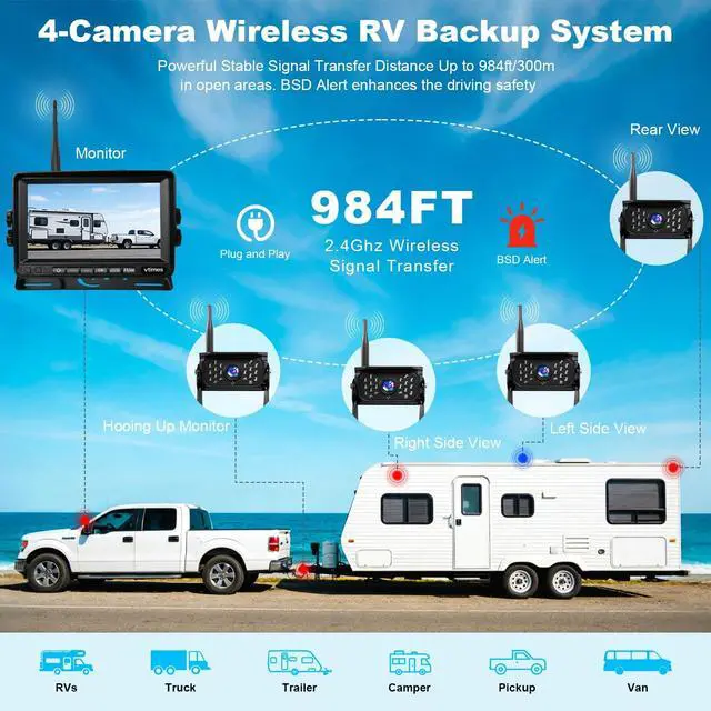 (Note: Four cameras included! ) ^^ Practical Fathers Day Gift for Safer RV AdventuresGive Dad the gift of peace of mind! This 4 channel wireless backup camera system eliminates blind spots and enhances driving safety, especially for RVs travel, trailer, camper, truck, hitching towing. Includes detailed installation instructions and video. Enjoy a 1-year warranty and lifetime tech support. Contact our after-sales team anytime for assistance. Perfect for Fathers Day or RV enthusiasts. A practical addition to any gift list!