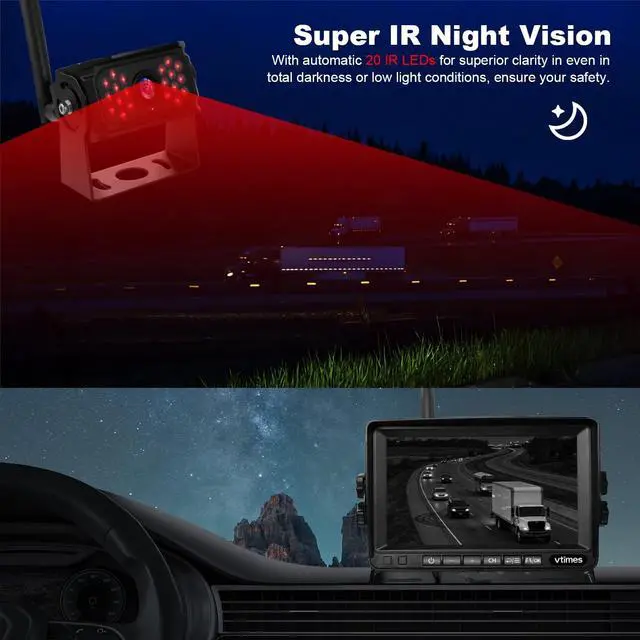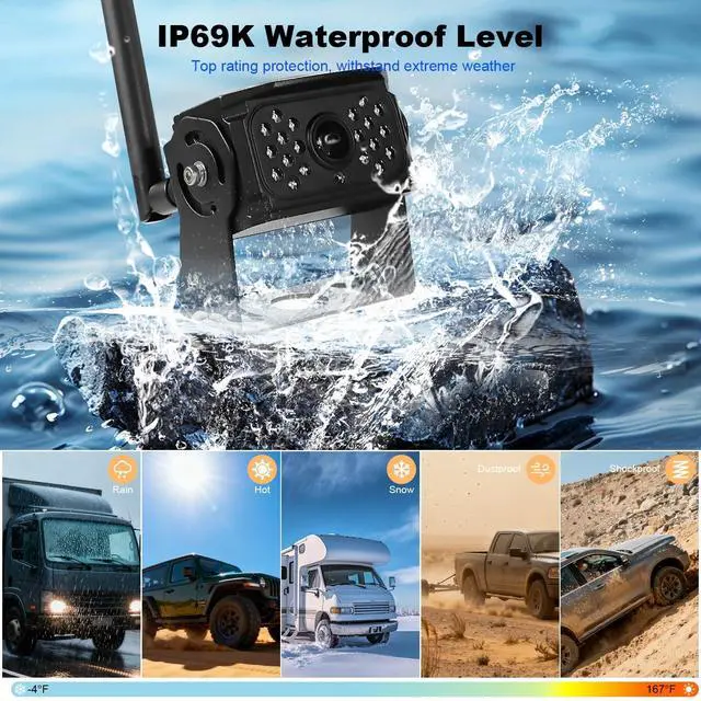 Strong Wireless Signal, No WiringRequired enhance your driving safety with our 7-inch 4 wireless backup camera system, designed for easy installation with no wiring. Featuring advanced CMOS image sensor technology with FM Encryption transfer, it ensures crystal-clear, uninterrupted video with no lag or signal loss, privacy security. With a powerful signal range of up to 984ft/300m in open areas and 120 wide viewing angle, this backup camera system is perfect for RVs, trucks, trailers, camper. ^^ Easy Installation with IP69K CameraVery easy to install the monitor and camera.