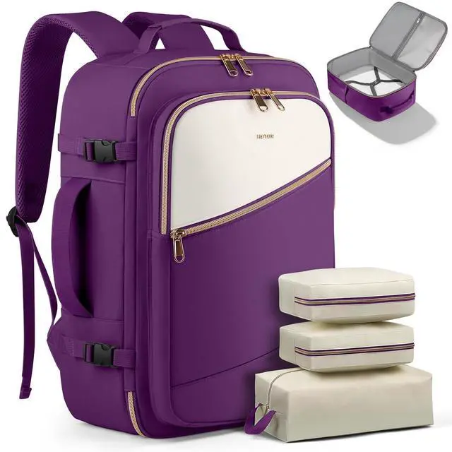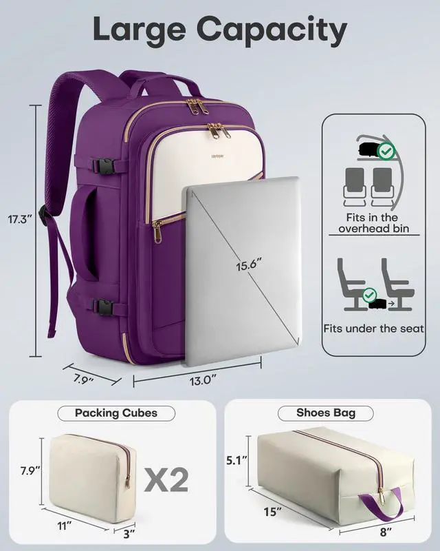 ^^ LARGE CAPACITY: Featuring a spacious main compartment along with three packing cubes, this backpack keeps clothes, shoes, and electronics neatly arranged. The elastic bungee prevents items from shifting during travel, allowing you to pack efficiently for 35 day trips. Ideal for travel bags for women or anyone looking for a well-organized personal item backpack.