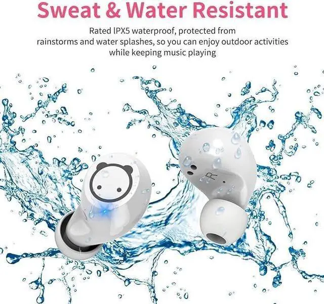 Three sizes of flexible silicone tips fit the shape of your ears, no more worrying about the earbuds falling out, ideal for sports, running, cycling, yoga, gym and more. IPX5 Fully sweat resistant, no interference with sports, music and calls. ^^ Charge On The GoWireless headset can last 4-6 hours on a single charge, and the cartoon charging box can be charged 3~5 times on the journey, charging for 5 minutes and 2 hours of calling, giving you the ultimate enjoyment.
