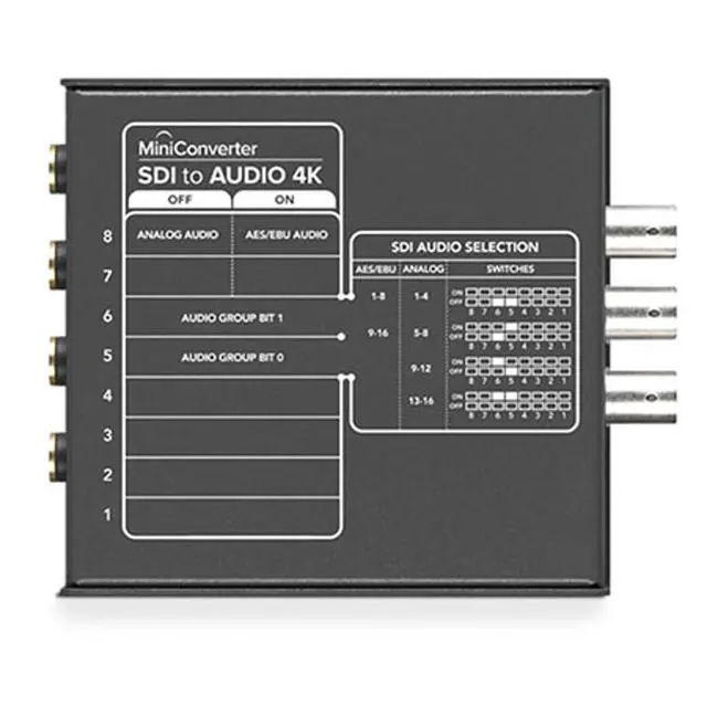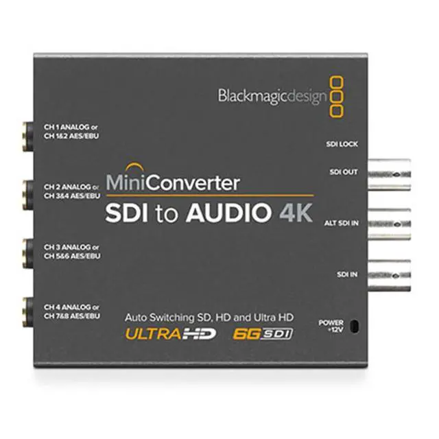 The Mini Converter SDI to Audio 4K has all the features you need to deenbed any SDI video connection to 4 channel analog audio or 8 channel AES/EBU digital audio. Allows access to audio from any SDI video input and output to audio devices such as audio mixers, analog broadcast decks, and audio monitors.