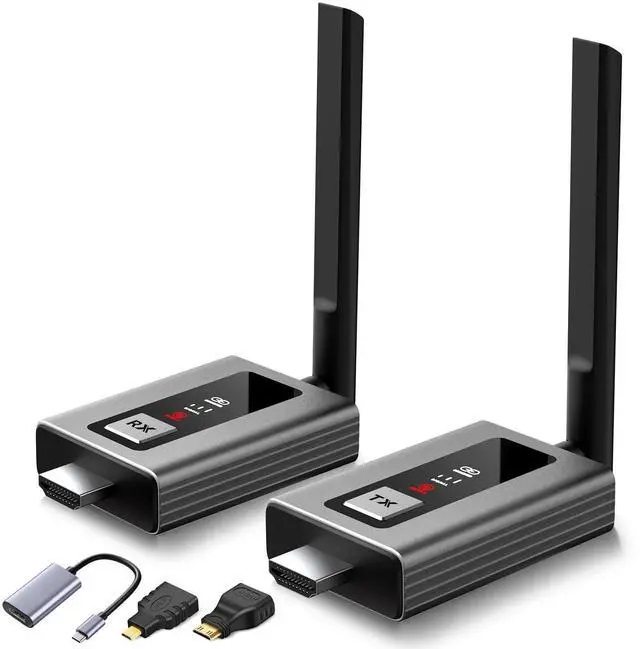 Package Includes: 1 x Transmitter, 1 x Receiver, 2 x USB-C Cable, 2 x Antenna, 1 x HDMI Extension Cord, 1 x mini HDMI to HDMI Adapter, 1 x Micro HDMI to HDMI Adapter, 1 x HDMI to USB-C/Type-C Conversion Cord, 1 x User Manual. Due to the different monitor and light effect, the actual color of the item might be slightly different from the color showed on the pictures. Thank you!