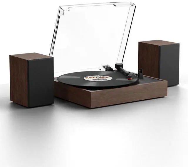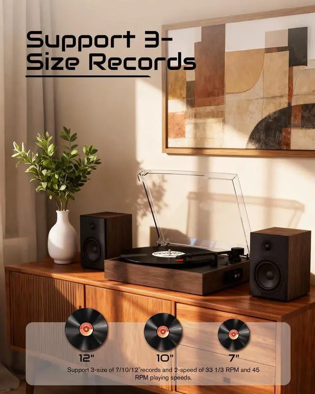 Two External Stereo Speakers - Enjoy rich and stereo sound. The record player comes with two integrated speakers for an all-in-one audio experience. Connect to external audio systems using the RCA output ^^ Bluetooth Input - Expand your listening options. Seamlessly stream music from your phone or other devices through the built-in Bluetooth connection ^^ Play Vinyl and Auto-stop - Immerse yourself in pure analog sound. Play your vinyl collection with precision, featuring auto-stop to protect your records when the side ends ^^ 33 & 45 RPM - Play your entire collection. This turntable supports both 33 and 45 RPM speeds, ensuring compatibility with all your standard records ^^ Vintage Design - This retro and compact record player also serves as a great decorative piece for your living room, bedroom, or store.