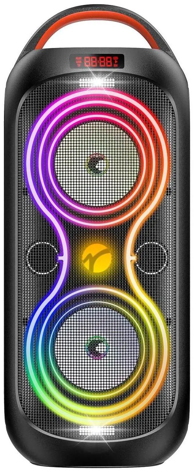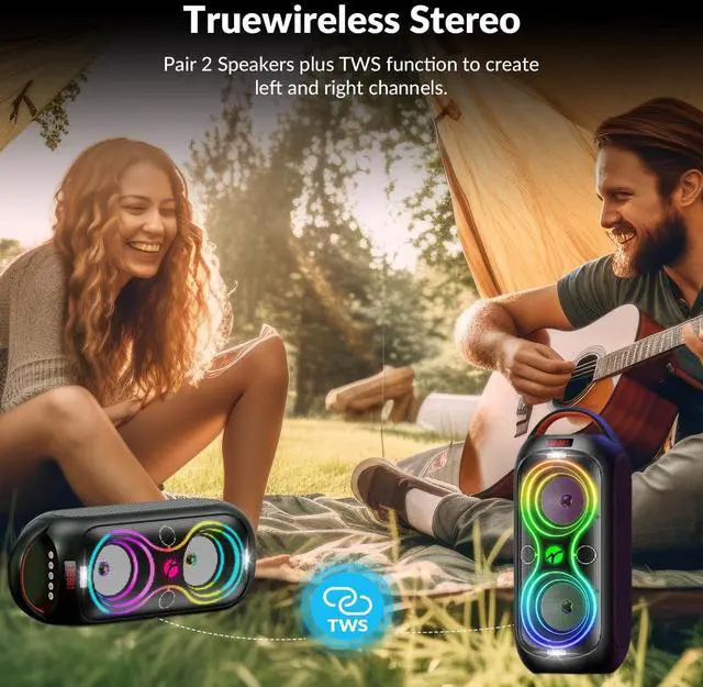 120dB Powerful Sound TWS Stereo Dual 4inch full-range drivers deliver crystal-clear trebles and punchy mids. Filling any space with clear audio, immersive sound up to 40W output powerful peak and 120dB loud sound. This speaker Ideal for both indoor and outdoor events, also turning your backyard, garage, or living room into a dance floor! ^^ Dynamic Beat-Driven Light ShowLight up your event with 8 colors & 5 styles of vibrant light show and dazzling breathing light modes (including strobe & rhythm sync). Every kind of music is better with a dynamic LED light show.