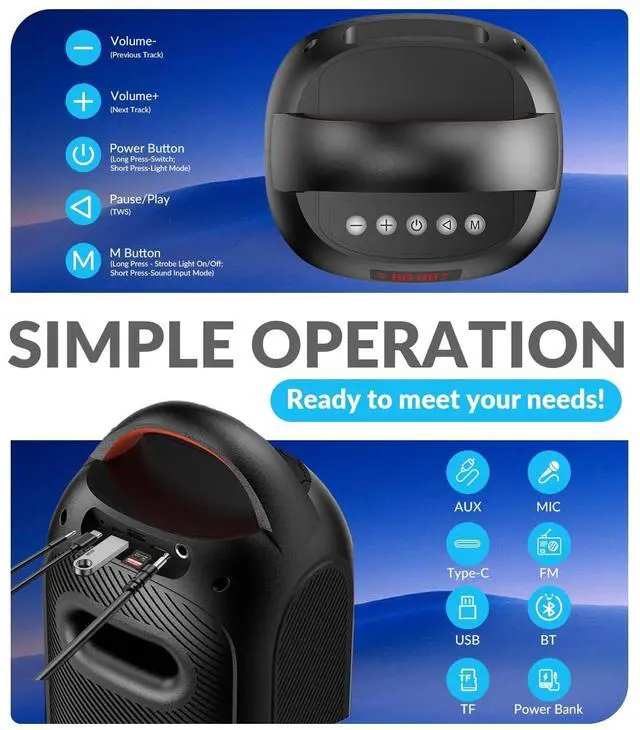 Perfect for late-night parties, outdoor gatherings, or setting the mood during solo jam sessions. ^^ Emergency Power Bank & Clear Display The built-in 3600mAh battery and fast charging keeps the music playing for up 8 hours and charges your phone on-the-go. The LED display shows volume, mode, and battery status at a glance. *(Playtime varies by music, volume and usage) ^^ Multiple Input OptionsThis Speaker Connect via wireless bluetooth 5.3 (stable & long-range) One-touch pairing. Apple and Android compatibility, a Micro SD card slot/TF card, AUX( 3.5 mm), USB or even FM radio.