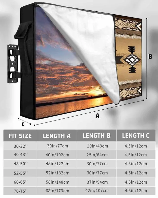 Universal Fit Elastic bottom straps secure the cover to any TV or mount for a snug fit. Stylish DesignsUpgrade your outdoor patio yard with this TV covers versatile aesthetics Whether you prefer modern minimalist, farmhouse, vintage retro, coastal blue, boho chic, or metallic luxeor festive themes like Christmas red/green, Halloween orange/black, Chinese New Year red, Thanksgiving neutrals, 4th of July stars and stripesthis cover blends seamlessly with any decor or celebrationVersatile Usage ScenariosPerfect for endless outdoor entertainment: backyard parties, patio movie nights, poolside BBQs, camping trips, garden brunches, balcony sports viewing, villa terraces, rooftop bars, courtyard gatherings, beach vacations, yacht lounging, tailgate markets, ideal for both home and commercial useGiftingPerfect as a housewarming, wedding, birthday, Mothers Day, Christmas, thank-you, hostess, retirement, bridal shower, anniversary gift.