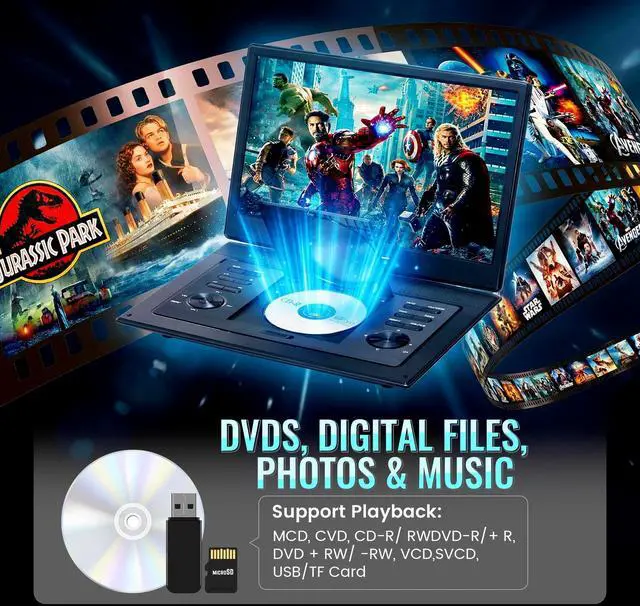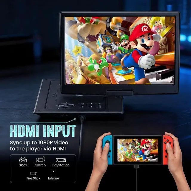 Portable DVD Player with Rechargeable Battery & 1080P Screen Enjoy high-definition entertainment anywhere with our portable DVD player. Featuring a built-in long-lasting battery, a rotating 1080P display, and a lightweight designperfect for cars, travel, and outdoor use. ^^ HDMI Input & Multi-Format Playback for Versatile ConnectivityConnect to modern TVs or projectors via HDMI input, and play videos, music, and photos from DVDs, CDs, USB drives, and SD cards. Supports a wide range of formats for all your media needs. ^^ Easy to Use with Remote Control & Memory PlaybackComes with a convenient remote control and auto-resume function, so you can easily pause and restart your movie right where you left offideal for kids and family movie nights.