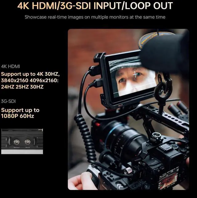 Loop In & Out: The VILTROX DC-X3 camera monitor features 4K HDMI ports support up to 4K 30Hz, 3840X2160p, 4096X2160p (30/25/24Hz) HDMI signals, 3G-SDI ports support up to 1080p 60Hz video signal, which synchronizes the camera footage clearly to a larger screen, allowing the directors and photographers to watch from different angles and enjoy real-time monitoring. Plus, you can monitor audio using the 3.5 mm stereo headphone jack. ^^ Full