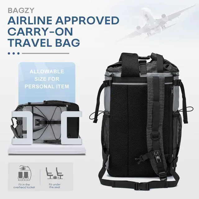 Personal Luggage SizeThe regular size of BAGZY roll-top backpack is 16x12x6 inches/40x30x15 cm (capacity is about 20 liters), suitable for carry-on luggage size on airlines. Easily fits under seats and on top of luggage racks. No additional baggage fees are required. ^^ Durable Waterproof MaterialThe travel backpack is made of lightweight and tough waterproof polyester fiber, which is not only tear-resistant but also effectively blocks moisture. There is a vertical zipper design on the side, and the large opening allows quick access to the items in the laptop compartment from the side, and the items inside are clearly arranged.