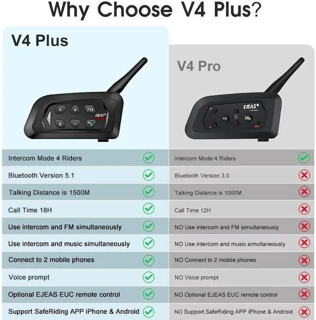 Clear and Stable SoundImproved CVC noise reduction technology and Bluetooth 5.1 provide clear and stable sound, even in noisy environments. ^^ Wide ApplicationsV4 Plus is suitable for most competition referees and outdoor activities like soccer, football, volleyball, basketball referees, golf referees training, construction sites, crews, venue scheduling. ^^ 4-Person Group IntercomV4 Plus allows 4 person to connect for conference intercom, with a total range of 1500 meters. ^^ Low Power ConsumptionWith circuit optimization, power consumption is reduced by 20%. Talk time is up to 18 hours, music playing time is up to 24 hours, with just 2 hours of charging.