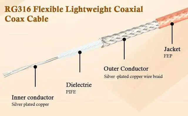 The Jacket is made of the flexible teflon that could be used so long in the harsh environments in the outdoor. ^^ Works Great- You can use this low loss rg316 coaxial cable to build antenna cables by crimping on some sma connectors. It's thin and flexible. The core is stranded, lightweight and very flexible which make them a perfect fit. ^^ Fit For- RG316 coax flexible cable fits for vhf/uhf/interconnections/balun antenna/ham radio/4g lte/ads-b/wifi.