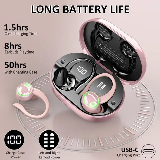 Charging Case: Bluetooth earbuds deliver up to 60 hours of total playtime with the charging case. Each earbud provides 8 hours of playback per charge, and the case can recharge the earbuds six times. A 10-minute fast charge via USB-C supplies an additional 2 hours of playtime. The earbuds are equipped with a dual LED digital display. During charging, the LED lights flash to indicate the charging progress, displaying the battery percentage from 1% to 100%. ^^ Ergonomic Sports Design and
