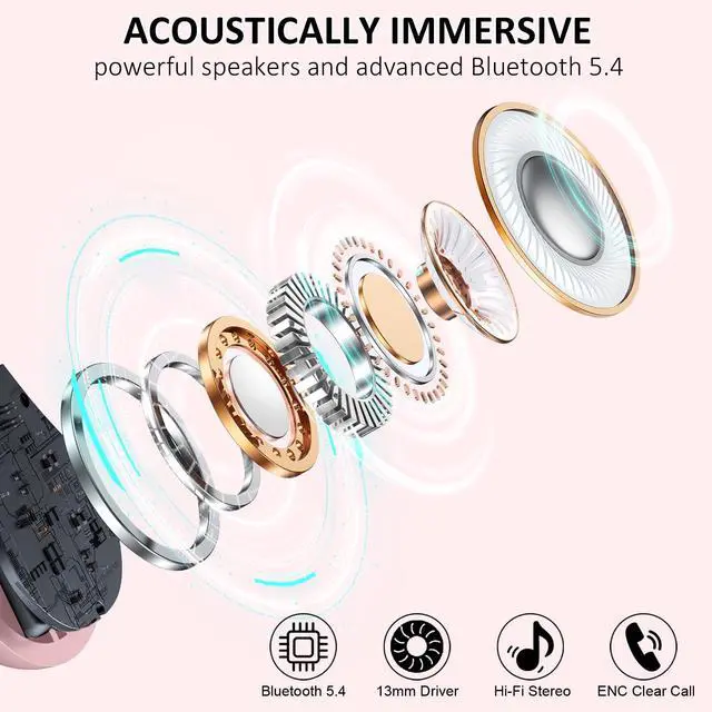 HD Clear Calls: Bluetooth earbuds feature a 4-sound chamber design with 14.2 mm graphene drivers, which are 30% larger than conventional types, to increase the audio frequency by 70% (18Hz-25kHz), delivering transparent highs and immersive bass. These ENC noise-cancelling wireless earbuds are equipped with four high-definition microphones, which boost vocal clarity by 75% and cut external noise by 80%, making sure your voice comes through loud and clear during calls. ^^ Bluetooth 5.4 and