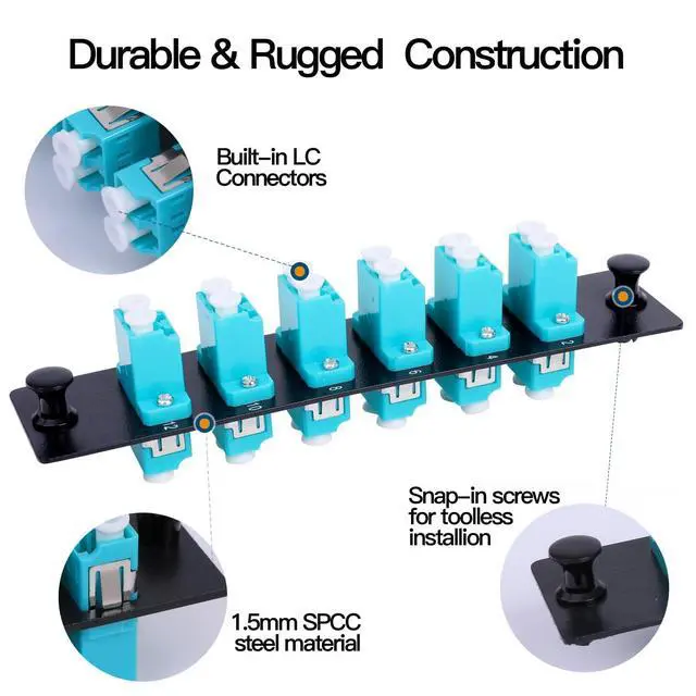 2PCS LGX Footprint Compatible OM3 Fiber Patch Panel Loaded with MultiMode 6 Duplex LC Adapters, Plate is designed with a Robust Steel Design. Make the installation and maintenance of the fiber optic cables more efficient. It's a long term, cost effective solution to securely transmit data requiring high transfer rates. Low Insertion Loss & Low AttenuationAssembled with duplex, small form factor, 1.25 mm ceramic ferrule, LC connectors designed for compact, high cable density environments. Connectors include pre-installed duplex LC clips Insertion Loss 0.3 dB, Return Loss 50dB. Plug and Play1.
