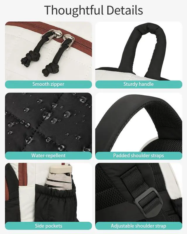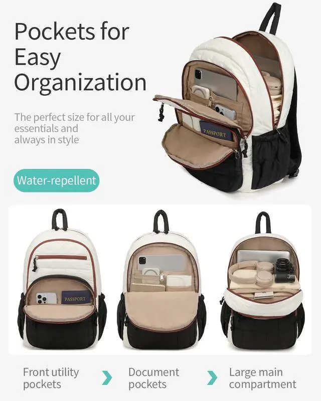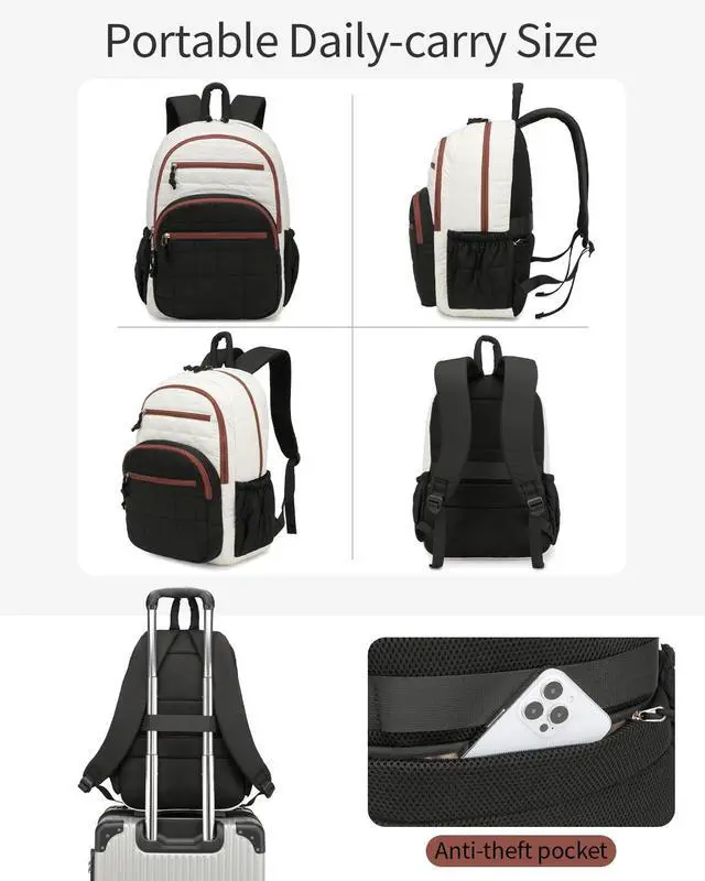 CLOKARS Bookbag for Women, Teen Girls Backpack for High School College Student, Puffer Quilted Back Pack Cute Laptop Backpack for Work Travel Mom Casual Daypack, Beige Black Brown
