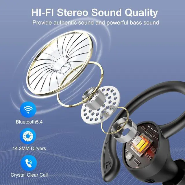 NEW GENERATION BLUETOOTH 5.4 TECHNOLOGY Experience an ultra-smooth, low-latency listening experience with wireless earbuds featuring the latest Bluetooth 5.4 technology, which boosts data transfer speeds by up to 75 per cent while consuming less power to maintain a stable connection even when used over long distances. After the first pairing, turn on the wireless headset to automatically connect to the paired device, no longer need to wait. ^^ IMMERSIVE 3D STEREO SOUND WITH CLEAR CALLSThe wireless sports headphones come with 14.2 mm dual-layer graphene drivers that deliver deep bass and CD-quality sound for vivid, detailed sound reproduction.