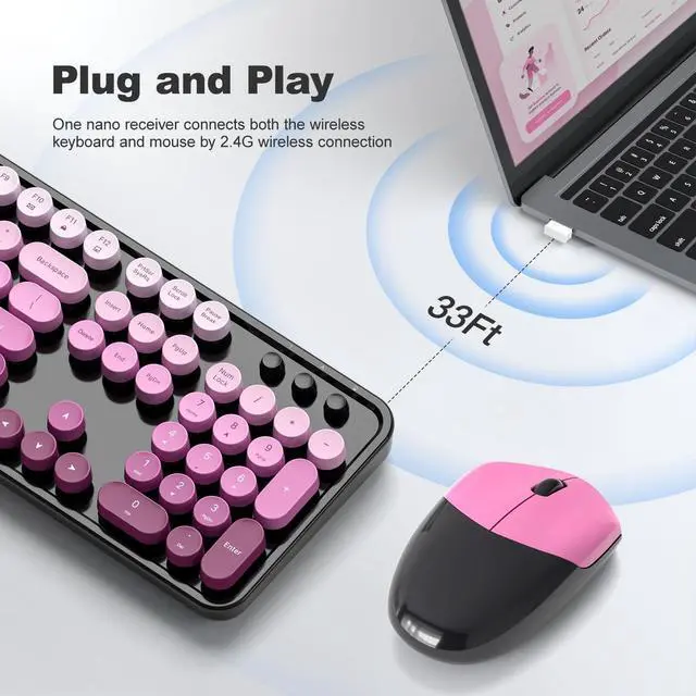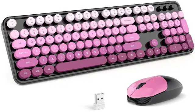 Wireless Keyboard and Mouse ComboFashion Multi-color Wireless keyboard and Mouse Combo- Enjoy Wireless Freedom. Stable wireless connection 2.4G wireless Keyboard and Mouse provides a powerful and reliable connection up to 10m (33 feet) without any delays. This wireless keyboard adopts a mixed-color design, using Laser printing, the letters on the keycaps will not easily blur or fall off. All 104 Keys non-conflict.