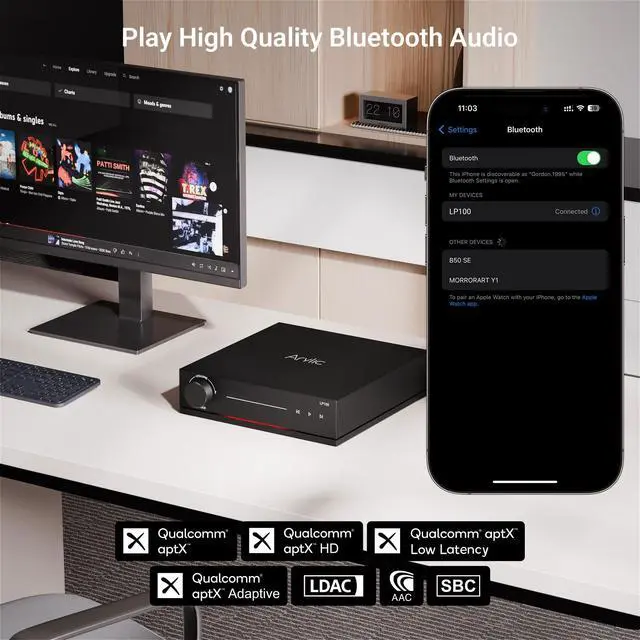 ^^ Hi-End Bluetooth Technology: LP100 features the latest Bluetooth 5.4 with the QCC3083 chipset, supporting LDAC, LC3, aptX Adaptive, aptX LL, aptX HD, aptX, AAC, and SBC. Transmit audio to your Bluetooth headphones or speakers, or play anything from your phone with high fidelity and low latency. With Auracast broadcast audio, LP100 can share the same stream with multiple Auracast-enabled devices simultaneously, delivering stable performance and next-generation wireless listening.