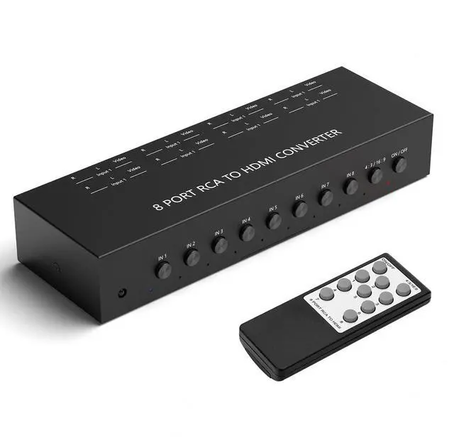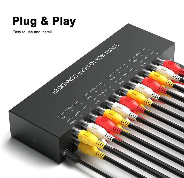 Converter Widely Compatiblity: Compatible with most RCA input devices. Compatible with Sega, WII, N64, NGC, SNES, PS1, PS2, PS3, Xbox, STB, VHS, VCR DVD Players, etc. HDMI output support TV and Projector, etc. NOTES1. Power supply needs to be connected. 2. It can not convert HDMI to AV converter. 3. 3D and 4K not supported. 4. Support warranty, If you have any use problems, please contact the seller's customer service, we will provide you with the most satisfactory after-sales service. Package Contents1* 8Port AV to HDMI Converter1* HDMI Cable1* UCB Type C Power Cable1* USB Power Adapter1* IR remote
