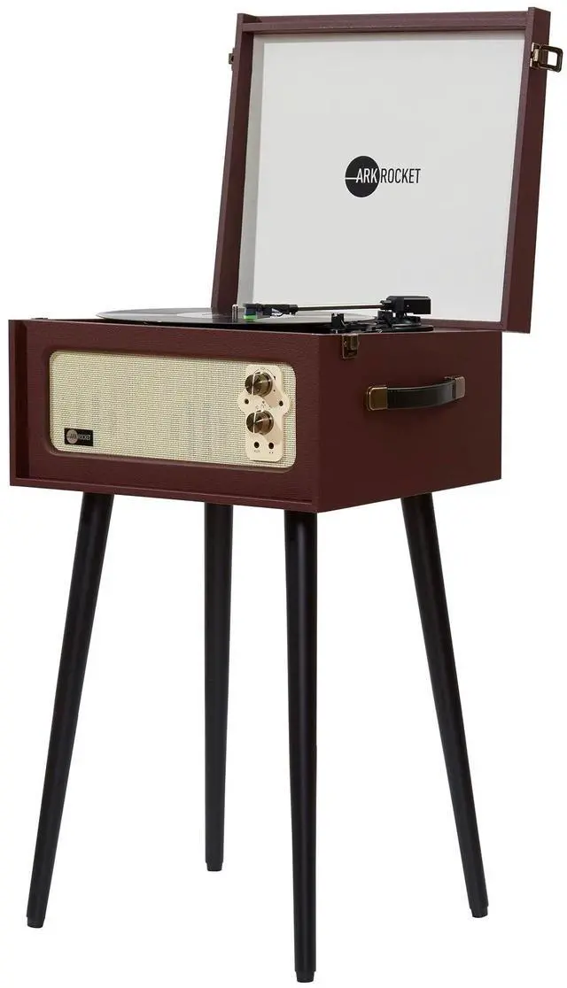 Vintage Aesthetic with Modern Features The Arkrocket Discovery II record player combines retro design with modern technology. Featuring a wood-crafted, leather-wrapped body and removable wooden legs, this turntable vinyl record console adds a touch of nostalgia to any room. ^^ 3-Speed Turntable with Rocket MM Cartridge Play your vinyl collection at 33, 45, or 78 RPM with precision. The Arkrocket Discovery II is equipped with a high-quality Rocket moving magnet (MM) cartridge and an automatic return tonearm, ensuring better sound quality and protection for your records. ^^ Bluetooth Connectivity With built-in Bluetooth, this console retro turntable functions as a bluetooth speaker, allowing you to stream music directly from your phone, tablet, or other Bluetooth-enabled devices.