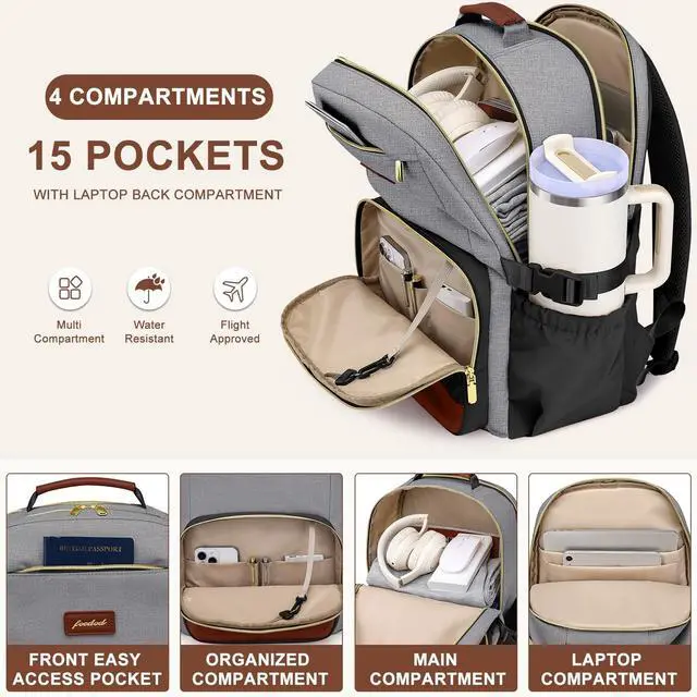 Multi-Pocket Backpack with Laptop CompartmentOur laptop backpack total of 4 compartments and 15 pockets for your 17 inch computer, A4 folders, bottles, umbrellas, clothes, iPad, cell phones, chargers, keys, pens, wallets, work supplies, college supplies and roomy space can even fit in 3 days of daily essentials.