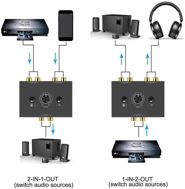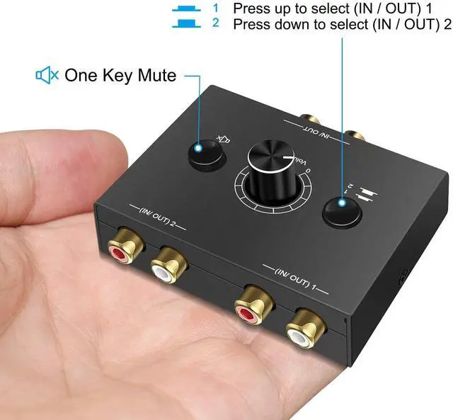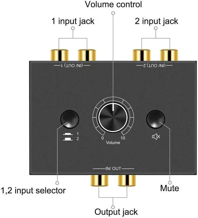 How to use: Connect two audio sources (like CD player / computer) to 1/2 ports and one audio output (like speakers) to IN/OUT port; Connect one audio source to IN/OUT port and two audio outputs to 1/2 port;