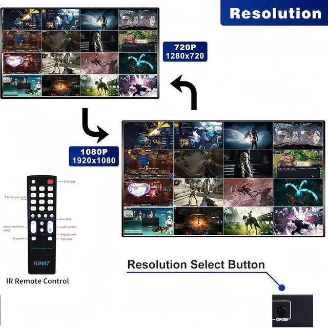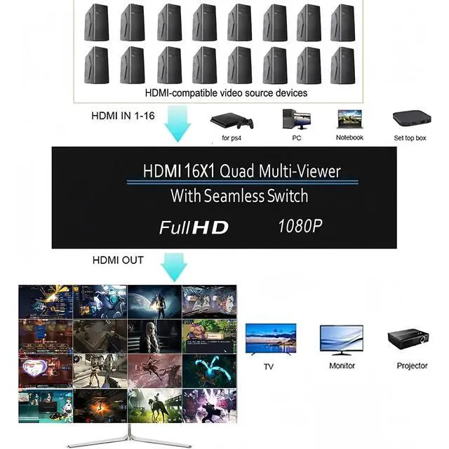 Support 4 models: 1x1 / 4x1 / 8x1 / 16x1 and 16 in 1 Out Seamless Switch 4 8 16 Way Display et; ^^ 16 Way Display et; *This 1080P HDMI Multiviewer 16X1 Support up to 1080p Full HD and 720P 720i et; ^^ *This 1080P HDMI Multiviewer 16X1 Support most HDMI Video source devices and display devices Support 16 in 1 Out Seamless Switch 4 8 16 Way Display; ^^ *This 1080P HDMI Multiviewer 16X1 Support wireless switch via product button or remote controller Compatible HDMI 1.3 a, HDCP 1.2; ^^ *This 1080P HDMI Multiviewer 16X1