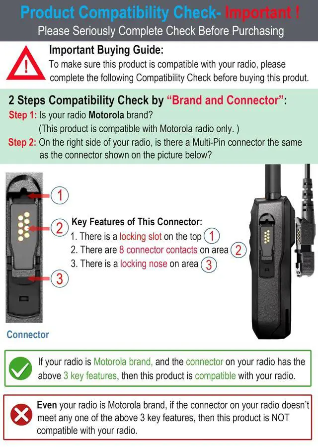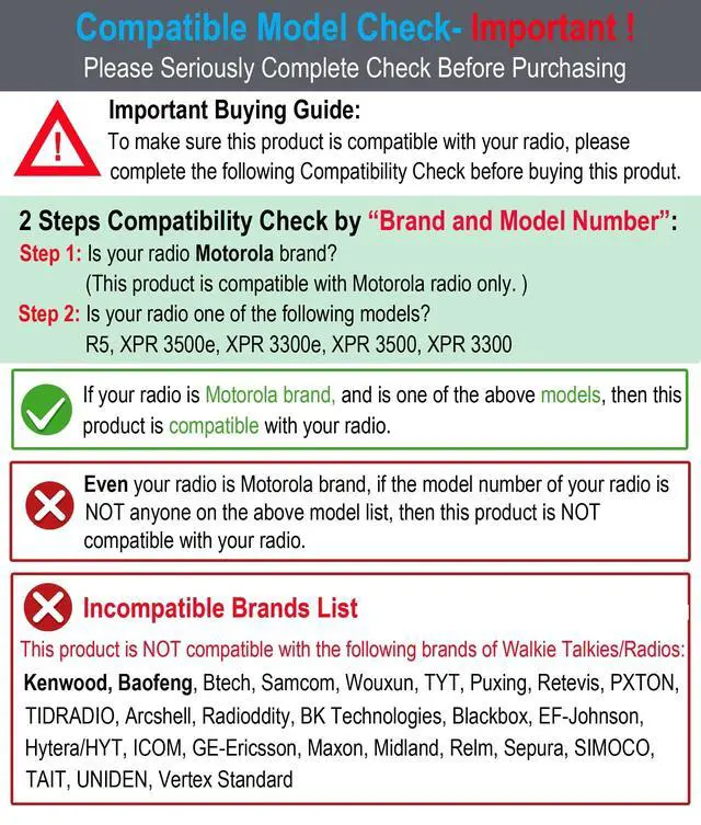 IMPORTANT NOTE: Please check product compatibility before purchasing; This mic is compatible with Motorola Radios R5, XPR 3300, XPR 3500, XPR 3300e, XPR 3500e (XPR3300, XPR3500, XPR3300e, XPR3500e); This is not Intrinsically Safe mic, this is not water-proof mic (IP 54), this is not high temperature mic.