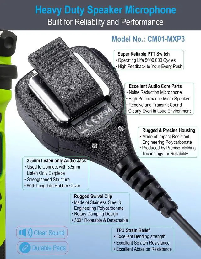 ^^ Rugged Construction: With high impact-resistant engineering Polycarbonate plastic housing, SMT electronic board, internal vibration absorption system, stainless steel detachable 360-degree rotatable heavy duty clip, combined with precise molding technology, this speaker microphone is built for tough mission critical use and is built to withstand knocks and bumps. ^^ Super