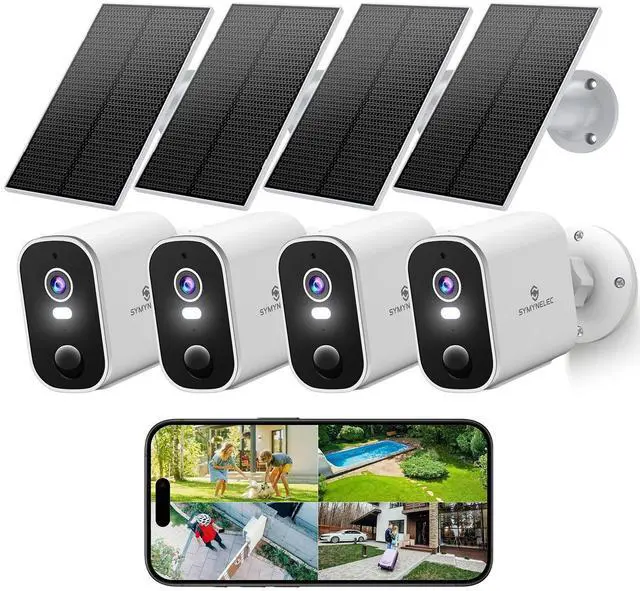 Zoom: Home security cameras deliver sharp 2K resolution with a 100 wide-angle lens. With IR night vision and HDR, it ensures clear views up to 33 ft. Use the Symynelec app to view up to 16 real-time videos, supporting 20 users ^^ 2.4GH z Wi-Fi Only, 100% Wire-Free, IP65