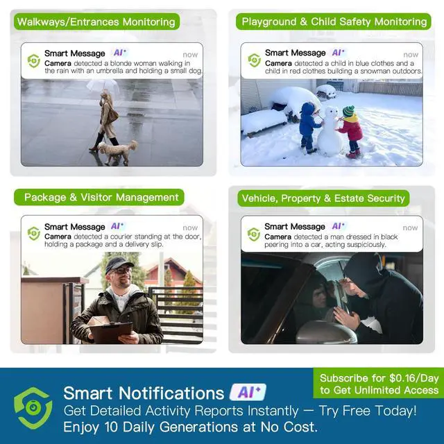 AI-Powered Descriptive Alerts: Unlike generic "motion detected" alerts, our camera uses AI vision to identify person, vehicle, package, pet, fire & more. Get precise notifications like "A courier with a package is standing on your front steps" with real-time snapshots. From security threats to delivery tracking, know exactly what triggers alarms ^^ 2K Ultra HD Resolution, Color Night Vision, 3x
