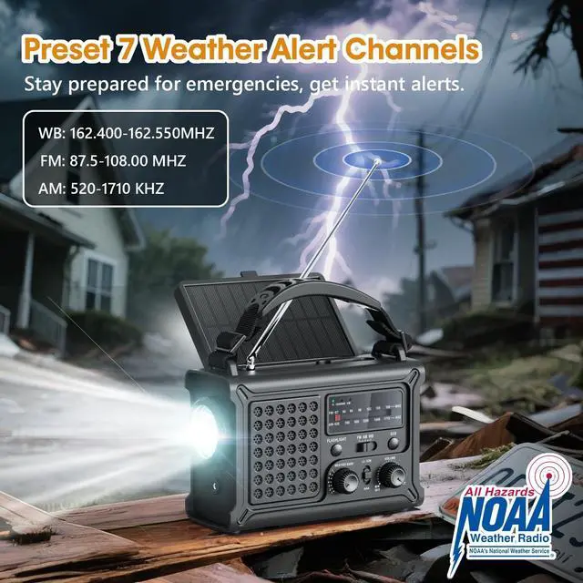 Emergency Use: Stay safe with real-time alerts from the National Weather Service. This weather radio keeps your family informed of hurricanes, tornadoes, floods, and storms, and other disasters. ^^ Faster Solar