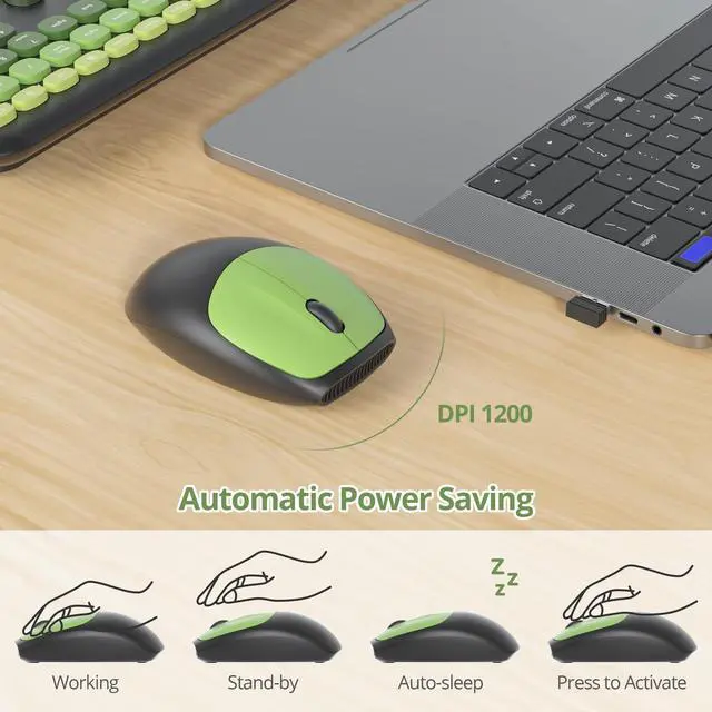 Auto-Sleep Mode: The green wireless keyboard uses 1 AA battery, while the wireless cute mouse also requires 1 AA battery (included). Both devices enter auto-sleep mode after inactivity, optimizing battery usage for extended life ^^
