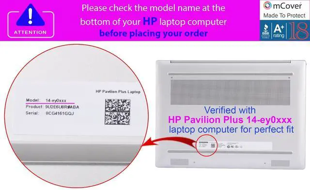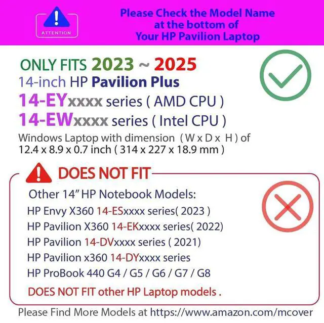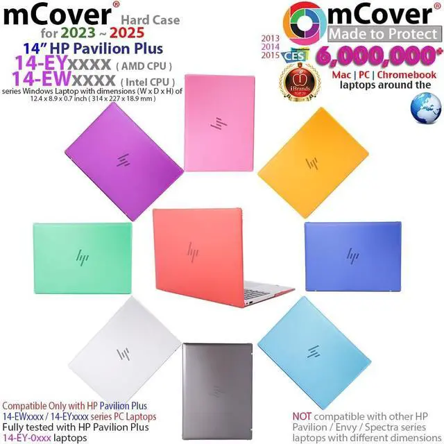 NOTE: Before placing order, PLEASE make sure to verify your laptop model number as this case is MODEL specific and NOT interchangeable. ^^ NOT fitting other 13", 14", 15", 16" and 17" HP Pavilion or ENVY or EliteBook notebook PCs. NOT compatible with other HP laptops as well. ^^ Made of new high-quality high-strength translucent polycarbonate material which is shatter-proof and will protect your 14-inch HP Pavilion Plus 14-EY0000 / 14-EW000 series Windows Notebook PC all around ^^ Designed to fit the 2023 - 2025 14-inch HP Pavilion Plus 14-EYxxxx / 14-EWxxxx series Windows Notebook PC with dimension ( Width x Depth x Height ) of 12.4 x 8.9 x 0.7 inch ( 314 x 227 x 18.9 mm ) ^^ 2-piece light-weight ( 8.8 oz or 249 g ) shell easily snaps on and off.