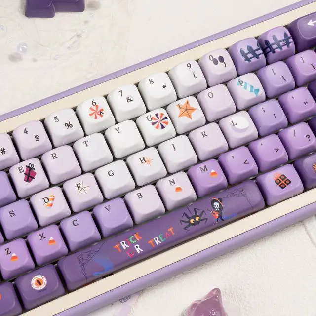Cute Keycaps: Features a festive Halloween design with classic spooky elements like pumpkins, ghosts, bats, and candy in a playful cartoon style, perfect for adding seasonal charm to your mechanical keyboard setup ^^ Purple and White
