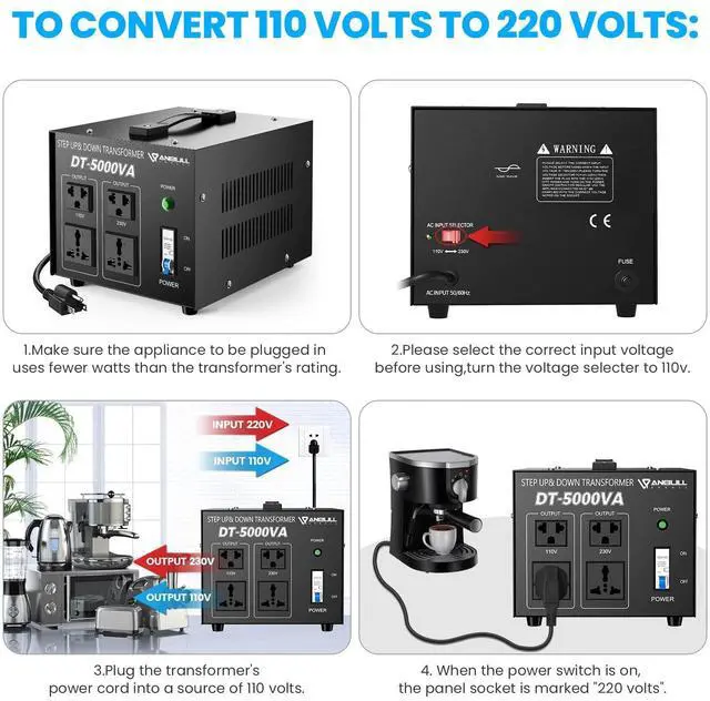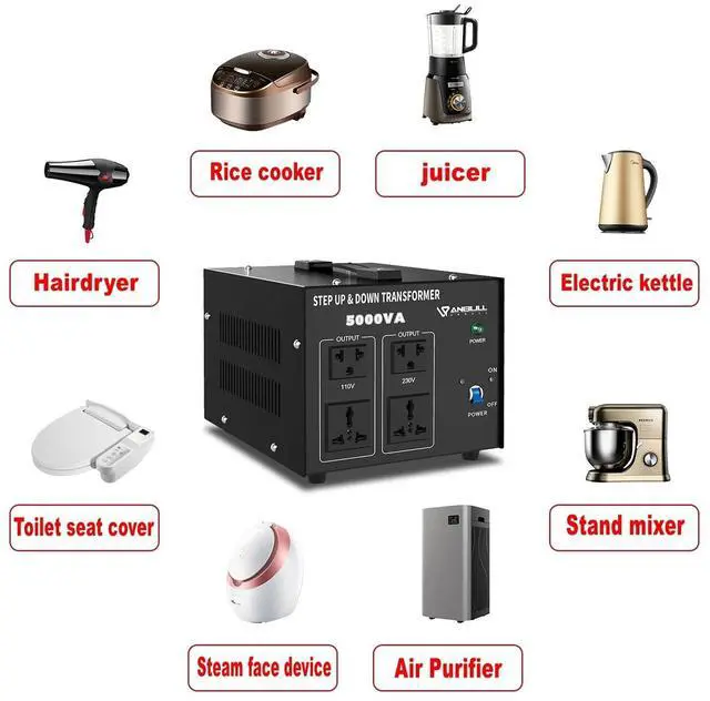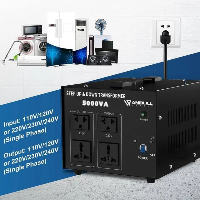 Watts: Heavy Duty Step Up/Down Voltage Transformer Converter 5000 Watts. Power ON/Off Switch, Can be Used in 110 Volt Countries and 220 Volt Countries, Step Up Voltage from 110V / 120 Volts to 220V / 230V / 240 Volts. Step Down Voltage from 220V / 230V / 240 Volts to 110V / 120 Volts.