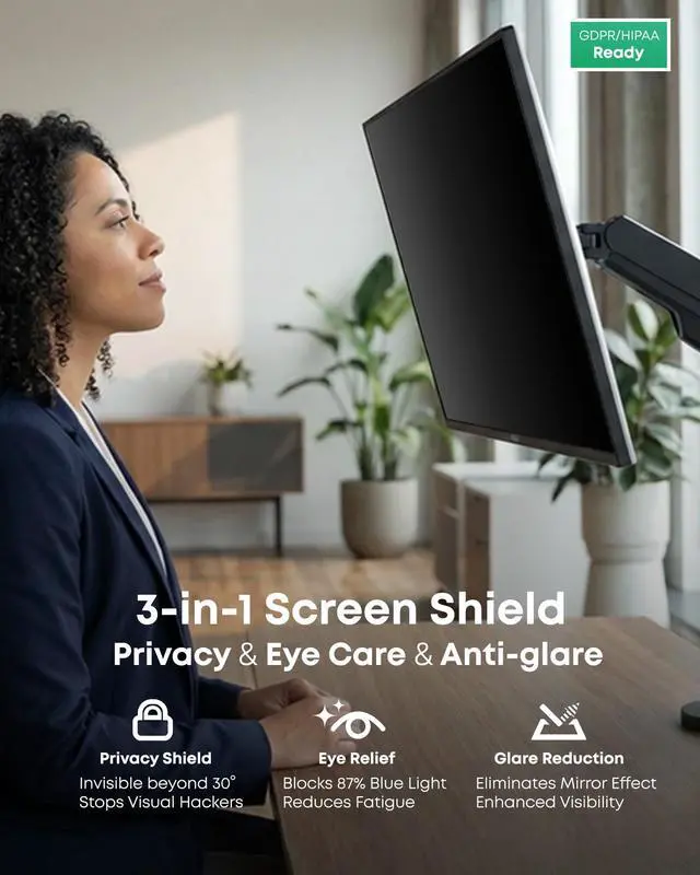 & EYE HEALTH: By sitting flush against the screen (zero gap), this film eliminates the "ghosting" and reflections common with hanging filters. It creates a restricted 60 viewing zone that turns black to side viewers, while maintaining a sharp, high-definition view for you. Simultaneously, the multi-layered coating acts as an Anti-Glare & Blue Light Filter, reducing eye strain and visual fatigue. ^^ PERFECT FOR CURVED MONITORS & TILTED ARMS: Unlike traditional filters (loose tabs, hanging types, or magnets) that swing away, bow, or fall off when the screen is tilted downwards (common with monitor arms), our 4-sided nano-grip frame defies gravity. It creates a secure, full-perimeter bond that keeps the film perfectly flat and tight against the screen at any angle, ensuring clear visibility without distortion on Ultra-Wide or Curved displays. ^^
