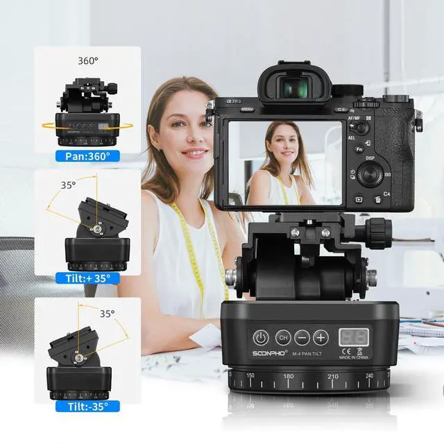 360 Horizontal &Tilt 50 Adjustment Soonpho M4 Panoramic Tripod Head support 360 horizontal rotation and 35 tilt angle adjustments. With rotation speed of 8-level adjustable, you can easily shoot panoramic blockbusters, adjust the angle of your live device, and easily control the camera view. ^^ Wireless Remote ControlRotating camera head with included remote control, supports wireless control of motorized heads in long distance. Beyond that, concise control panel and clear screen display will help with precise control. ^^ Built-in Battery Built-in battery ensures more than 8-10h working time. Soonpho M4 motorized pan tilt head support Type-C charging.