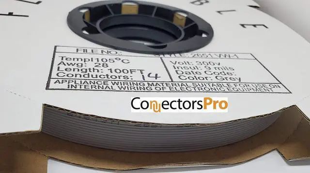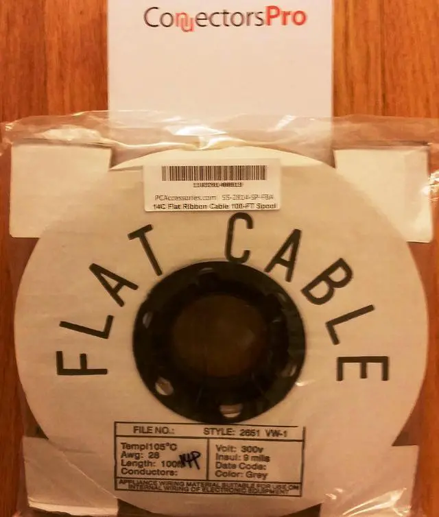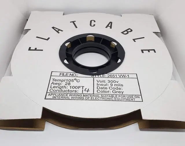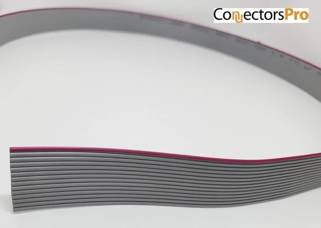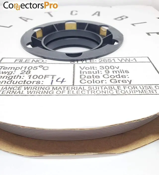 Standard 1.27 mm ( 0.05" ) Spaced Grey Flat Ribbon Cable 14C, 14-wire, Bulk 100-Ft Flat Ribbon Cable. General Description Use this flat ribbon cable to build your own custom cables. It is available in a number of varieties, each with a different number of conductors. It is perfect for use with insulation displacement connectors (IDC). One edge of the cable is color coded, which is conventionally used to indicate pin 1 of a cable. This wire is sold by 100-foot spool. If you want to order less than 100 feet, you can order from our per foot item.