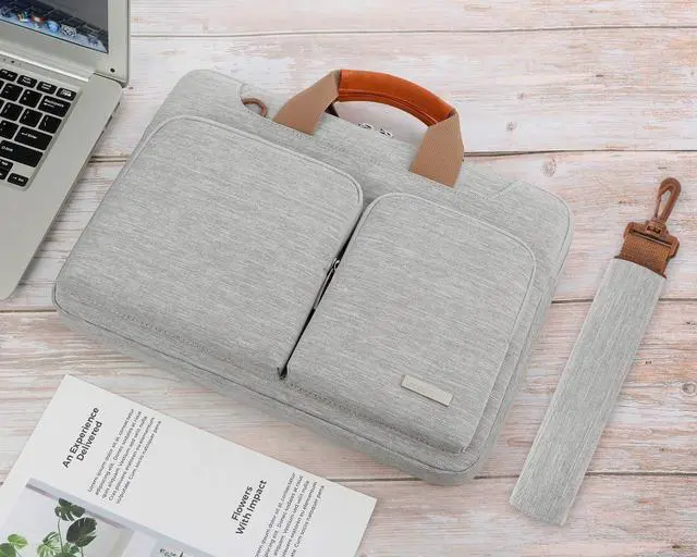 carry options include: grab handles, shoulder strap, the rear trolley strap. Top handles also can tuck away in the pockets when not needed. A slim and sleek profile allows this laptop sleeve to fit directly into your backpack, bag, briefcase, suitcase. It is a well-made laptop bag for 13-inch macbook that can be an anniversary or holiday gift.