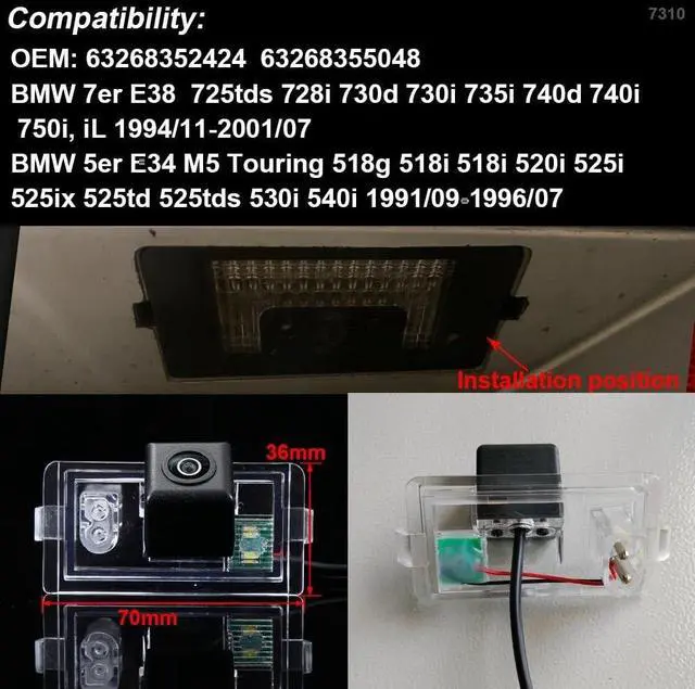 OEM: 63268352424; 63268355048Replacement for BMW 7er E38 725tds 728i 730d 730i 735i 740d 740i 750i, iL 1994/11-2001/07; Replacement for BMW 5er E34 M5 Touring 518g 518i 520i 525i 525ix 525td 525tds530i 540i 1991/09-1996/07Since the same car model may have differences in different countries, please check the camera size and compare your car's installation carefully to avoid mistakes.