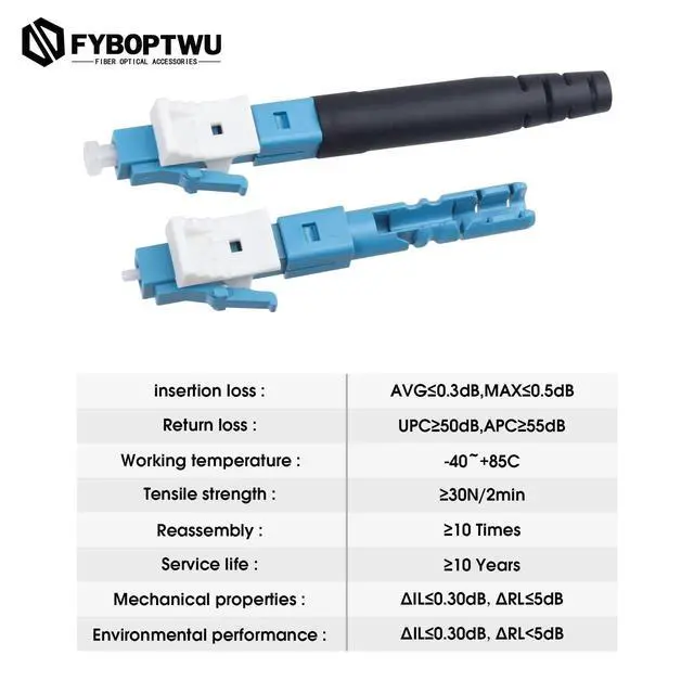 Loss: <0.3dB, Return Loss: > 50dB. High repeatability, insertion and extraction>500 times. ^^ Easy to installincluding fiber guide mechanism, more convenient to wear fiber. The package contains installation instructions. ^^ MaterialMade of high performance materials, more durabler, resistant to high temperature and falling. ^^ ApplicationSuitable for 0.9 mm/ 2.0 mm/ 3.0 mm round fiber cable and 3.0 * 2.0 mm drop cable.