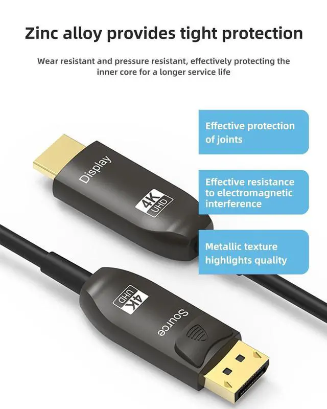 "4K@60Hz Resolution", 4K DisplayPort to HDMI cable is a work from home must-have that supports up to 4K@60Hz, superb clarity for view without lagging. Backward compatible. Experience ultra-sharp 4K resolution at 60Hz refresh rates with vibrant HDR10 colors, delivering cinematic visuals for gaming, movies, and streaming. ^^ "Outstanding Features", Built with advanced fiber optic cores for zero signal loss over long distances (up to 50ft/15m) and ultra-high bandwidth (18Gbps) for lag-free 3D, and eARC audio. ^^ "Reliable Connection", Seamlessly connect DisplayPort laptops/PCs to HDMI displays (or vice versa) with plug-and-play functionalityideal for MacBook, PS5, gaming monitors, and 8K-ready TVs.