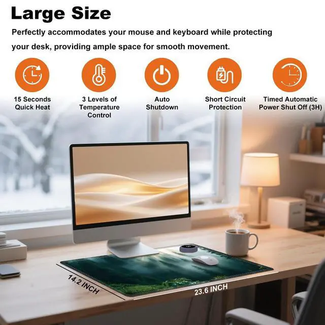 Stay Warm & Productive Our Heated Desk Pad ( 23.6" x 14.2" ), designed to keep your hands and workspace cozy during long work sessions, Perfect for cold winter days at home or in the office Heated Mouse Pad Warmer Mouse Pad Featuring fast heating in 15 seconds Covering 95% of the surface for consistent warmth Offers three temperature settings 104F (40C), 113F (45C), 122F (50C) Constructed with a four-layer safety designincluding waterproof PU leather, heating sheet, protective film, and a non-slip base Desk Warmer includes overheat protection, over-current protection, and an automatic shut-off after 3 hours Heated Desk Pad perfect for cold offices, home workstations and gaming Smooth Surface & Non-Slip Base Durable and easy to cleansimply wipe with a damp cloth Smooth Surface Allows more accurate and faster movement of the mouse, and provides better reaction and control Bottom non-slip base will provide heavy grip and prevent sliding or unnecessary movement Multifunctional Mouse Pad Large Surface Functions as a smooth mouse pad, desk protector or writing mat Also Works as warm desk pad, keyboard pad hand warmer, or foot warmer Exquisite Forests Pattern Printing Warm Mouse Pad with Unique and exquisite design patterns and bright colors, comfortable and durable, bring more fun and personality to living office environment More styles more patterned, please search {BFSEROBJ Heated Mouse Pad} Get the mouse pad you want most
