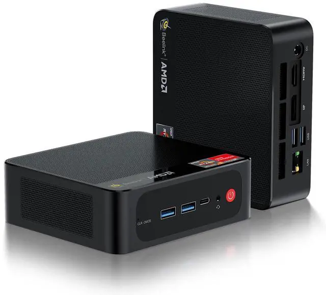 Triple screen display output via 4K@144Hz DP 1.4 + 4K@60Hz HDMI 2.0 + 4K@120Hz Type-C, which enable you to multi-task easily, and enough to meet your various needs, such as Adobe application, 4K web surfing, and video playback. In addition, the FPS is up to 60FPS, and you can play Dota 2, CS: GO, LOL, and other online games. ^^ 24GB LPDDR5 RAM & 500GB PCIe 4.0 x4 SSDThe Beelink SER5 MAX small pc 24GB LPDDR5 6300MHz RAM &500GB M. 2 2280 PCIe 4x4 SSD, reading speed up to 5000Mb/S. Dual channel memory slots is expandable up to 24GB (2x12GB), you can also replace the 500GB Dual SSD up to 8TB (Max UP to 4TB each SSD). The micro computer redesigned the fan bracket, system fan and SSD cooler parts to improve the overall heat dissipation function. ^^ Wifi 6 & BT 5.4 & USB 3.2T he Beelink Ryzen 7 Mini PC Built-in latest-generation Wifi 6 wireless card, which is 2x faster than WIFI 5, The transmission speed is up to 1200Mbps, which is faster and more stable than WIFI 5. The main features of Bluetooth 5.4 are the enhanced ATT protocol, faster connection speed and better anti-interference. USB 3.2 Gen2 (10Gbp) has increased the bandwidth rate from the original 5GB/S to 10GB/S. USB 3.2 Gen2 also supports direct output of video and audio. ^^ Small Form Factor & Rich InterfacesThe 4.9 x 4.4 x 1.6 inches Beelink SER5 MAX small computer is enough to save a huge space.