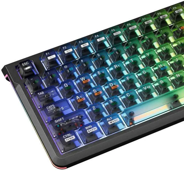 [ & ] The key cap is Black and transparent, and the light blue of the picture is the lighting effect. This is a set of keycaps that does not include a keyboard, which is used only as a display. Every keycap set is carefully quality test and well packaged to arrive in perfect condition. If any keys are missing, damaged, or dont fit as expected, just contact us and well quickly resolve the issue at our fast! ^^ [ & ] Made of advanced PC material, these clear keycaps are resistant to friction, wear and tear, ensuring a long-lasting and comfortable gaming experience.