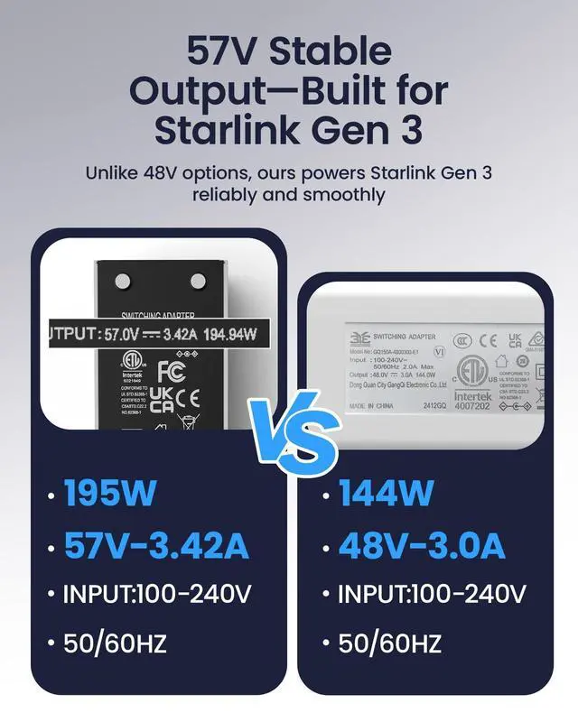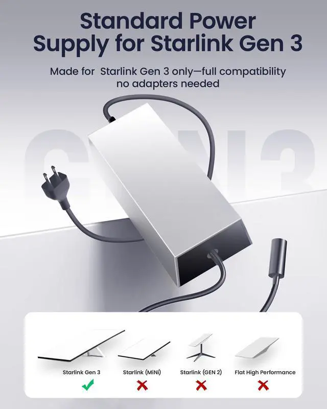 [1. Direct Replacement for Starlink Standard Gen 3] Specifically designed as a replacement charger for the Starlink Standard Gen 3 system, this modular power supply includes a detachable DC extension cableconnect 2ft to 60ft DC-to-DC cables with ease. Perfect for custom home, RV, or off-grid installations. ^^ [2. True 195W Output for Stable Connectivity] Delivers full 57V 3.42A (195W) outputstronger than typical 48V 3A (144W) adapters. Ensures a stable Starlink connection, even in high-demand environments or extreme weather conditions. ^^ [3. OEM-Style Look, Professional Finish] Features a matte finish and compact form factor to match the original Starlink Gen 3 power supply.