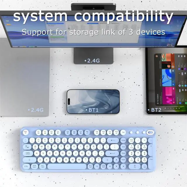 ^^ Seamless Multi-Device Connectivity: Boost your productivity with effortless switching between devices using our wireless keyboard's versatile dual-mode optionsBluetooth and USB. Connect up to three devices simultaneously, making multitasking seamless and efficient whether you're working on a PC, laptop, or tablet. This feature is perfect for collaborative environments where multiple users can easily share the keyboard without any hassle. ^^ Wide Compatibility for