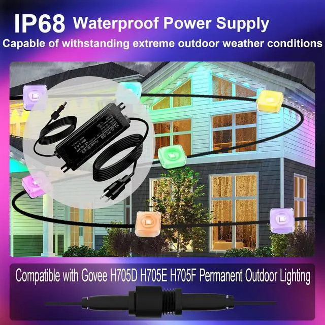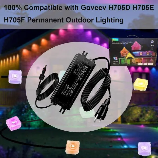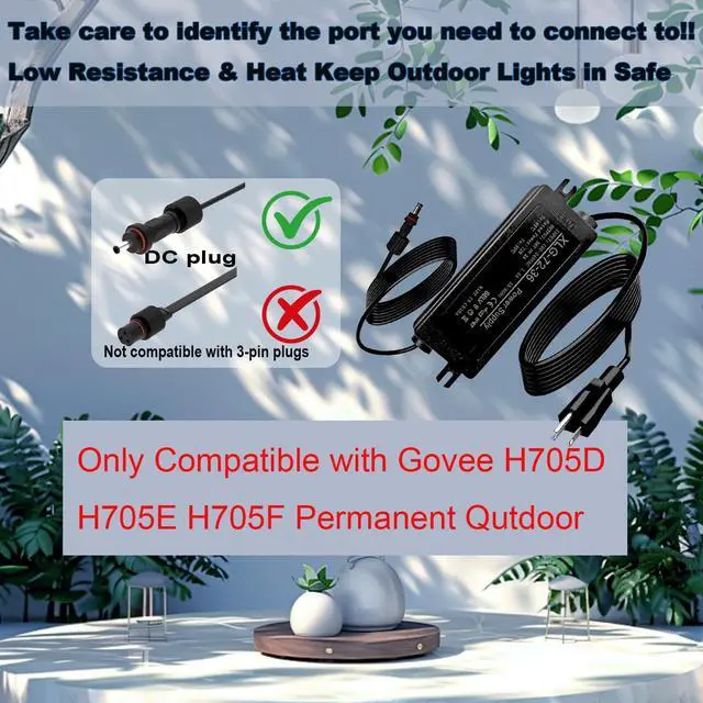 Important Notice: This power adapter must be used exclusively with the controller. Never connect it directly to the lamp interfaceincorrect connection will cause device damage or malfunction. Additionally, this product features a round plug (not a three-prong grounded plug). Before purchasing, carefully verify the plug type of your existing power adapter. ^^ NOTE! This Adapter Is Only Applicable To Govee Permanent Outdoor Lights 2 ( H705D/ H705E/ H705F). Please Note That The Old Version Permanent Light(H705A/H705B/H705C) Is Not Applicable To This Adapter! ^^ High safety factorInput