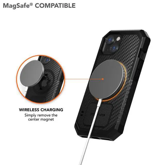 MAGNETIC CASE: Includes 2 powerful industrial-grade magnets built into iPhone 13 Case + a MagSafe compatible magnet array to work with Apple MagSafe chargers and accessories. Sticks to ANY magnetic surface and will NOT affect Credit Cards, Wi-Fi, GPS, or Bluetooth.